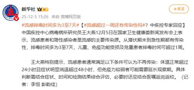 据@新华社消息,中国疾控中心病毒病所研究员王大燕12月5日在国家卫生健康委新闻发布会上表示,流感患者和隐性感染者是流感的主要传染源。从潜伏期末到急性期都有传染性,排毒时间多为3至7天,儿童、免疫功能受损及危重患者排毒时间可超过1周。