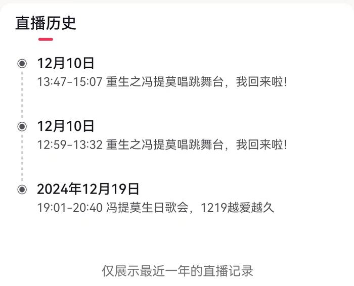 据抖音APP显示,冯提莫上一次直播是在2024年12月,距今已经有一年时间。冯提莫表示,直播是自己喜欢的事情,所以康复后就复播了:“医生也说后面正常生活和工作,保持好的心态,不要过度消耗自己的身体精力就好了。”