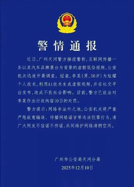 用AI生成“车展虚假低俗视频”,李某被行拘10日