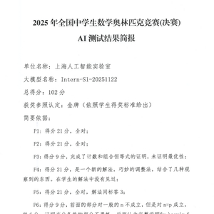 CMO是中国最高规格的数学奥林匹克竞赛,今年,主办方首次设立AI测试环节,邀请大模型与人类同场答题,并交由相同的评委专家组阅卷打分。上海人工智能实验室旗下的书生科学多模态大模型(Intern-S1-20251122)拿到102分。