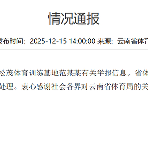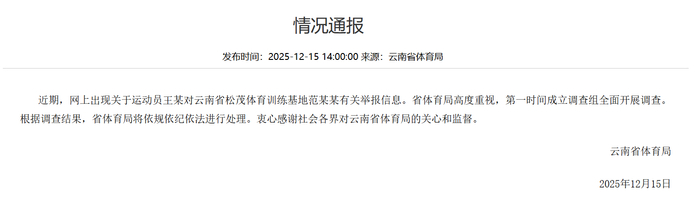 通报称:“近期,网上出现关于运动员王某对云南省松茂体育训练基地范某某有关举报信息。省体育局高度重视,第一时间成立调查组全面开展调查。根据调查结果,省体育局将依规依纪依法进行处理。衷心感谢社会各界对云南省体育局的关心和监督。”