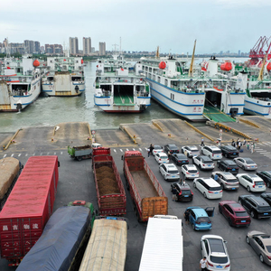在海南省海口市秀英港,客滚船在装卸乘客、车辆(无人机照片)。新华社记者 郭程 摄