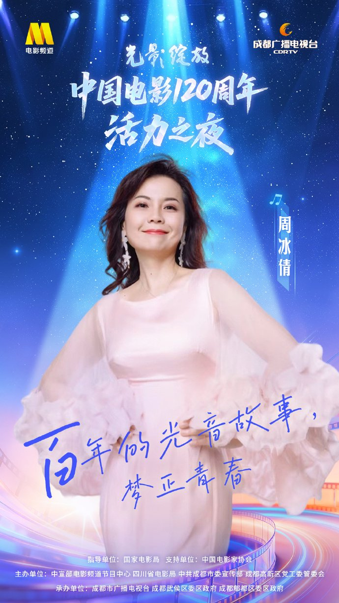 目前,参加“中国电影120周年活力之夜”的嘉宾阵容已官宣,黄绮珊、李宇春、林志炫、王菀之、杨坤、周深、周兴哲等实力歌手将激情开唱。周冰倩将献唱《真的好想你》,周冰倩表示,能在中国电影120周年之际再度唱响这首经典老歌,有一份特殊的意义。