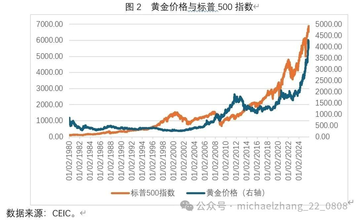 长期以来,黄金被视为一种避险资产。这意味着,在大多数情况下,黄金价格走势应该与主流风险资产走势不相关或者负相关。如图2所示,在历史上,黄金价格走势与美股指数走势之间的确存在较为明显的负相关。然而,自2022年第四季度至今,无论标普500指数还是黄金价格都出现了持续显著的上涨。在这一期间内,标普500指数翻番,黄金涨幅甚至超过了标普500指数。对这一现象较为合理的解释,是在全球经济与政治风险明显上升的背景下,美股依然走出了相对独立的牛市行情。问题在于,未来美股与黄金是否还能集体上涨?如果两者重新出现背离,是美股先调整,还是黄金先调整?
