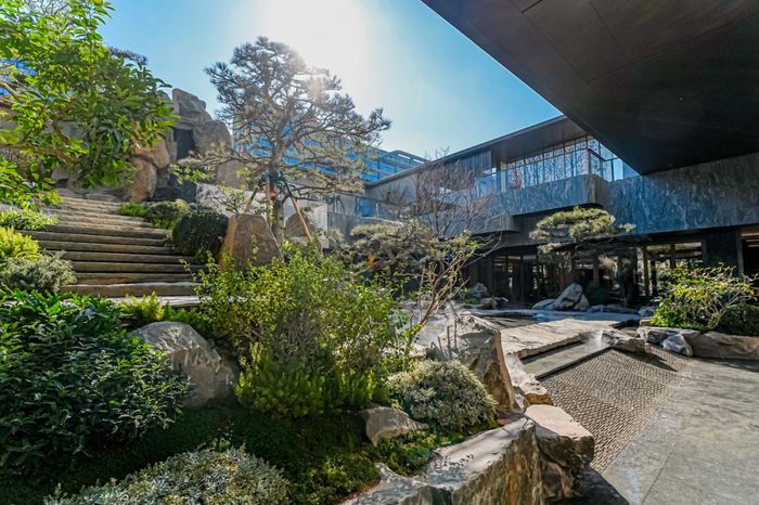 庭院以“叠翠池”为中心,叠石、瀑布、松林错落有致,构成一幅立体的山水画。为了还原岭南园林“石为骨,水为魂”的韵味,特意选用了山西黑老石皮与蓝钻花岗岩,与流动的水景形成刚柔对比。庭院与建筑之间通过廊桥、二层“盈月门”巧妙衔接,每一步前行都能邂逅不同的风景。