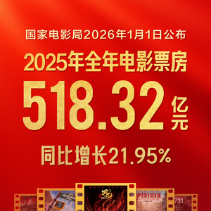 国家电影局2026年1月1日公布,2025年电影票房为518.32亿元,同比增长21.95%,城市院线观影人次为12.38亿,同比增长为22.57%,国产影片票房为412.93亿元,占比为79.67%。