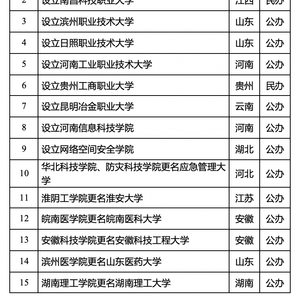 除职业本科外,公示名单中显示的拟设置院校还包括河南信息科技学院和网络空间安全学院,性质亦均为公办,后者办学地点位于湖北。