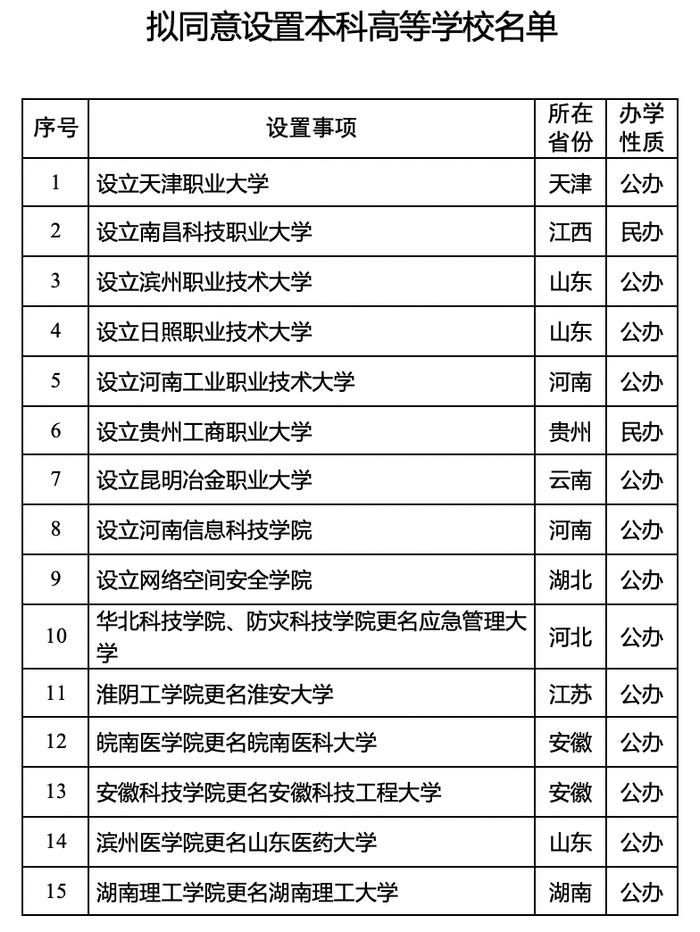 1月4日,教育部发展规划司发布《关于拟同意设置本科高等学校的公示》,拟同意设置天津职业大学等15所学校,其中7所为职业本科院校,此外,华北科技学院、防灾科技学院更名应急管理大学也在公示名单中。