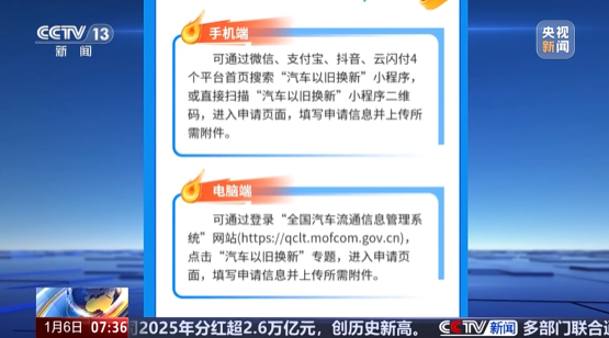 此外,消费者可以通过电脑登录“全国汽车流通信息管理系统”,点击“汽车以旧换新”专题进入申请页面。也可以在相关网络平台的“汽车以旧换新”小程序上进行申请。