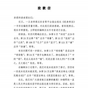 1月6日22时许,人民文学出版社发布《致歉信》称,近日,一五老师通过抖音等平台指出我社《经典常谈》一书存在编校质量问题,对此我们深表感谢。看到视频后,我社非常重视,立即组织编辑及社外专家进行自查。