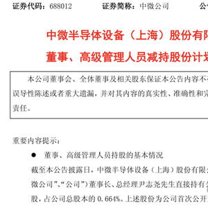 截至公告日,尹志尧直接持有公司415.94万股股份,占总股本的0.664%,所持股份为IPO前取得。经计算,减持过后,尹志尧持有的中微公司股权比例将降低至0.62%。