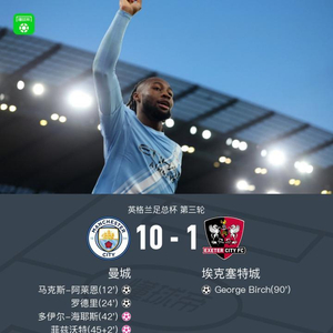 北京时间1月10日,英格兰足总杯第三轮展开较量,曼城迎战埃克塞特城。马克斯-阿莱恩、罗德里、塞门约、赖因德斯、尼科-奥赖利和瑞安-麦克杜各自攻入一球,多伊尔-海耶斯和菲兹沃特不慎自摆乌龙,里科-刘易斯则上演梅开二度。埃克塞特城方面,乔治-伯奇在终场前打进挽回颜面的一球。最终全场比赛结束,曼城10-1战胜埃克塞特城顺利晋级下一轮。