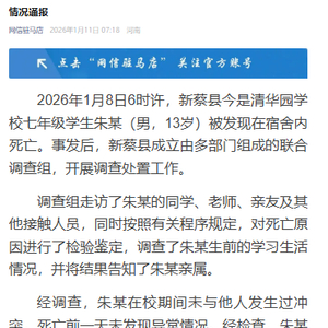 新京报讯 1月11日,河南新蔡县联合调查组发布情况通报,2026年1月8日6时许,新蔡县今是清华园学校七年级学生朱某(男,13岁)被发现在宿舍内死亡。事发后,新蔡县成立由多部门组成的联合调查组,开展调查处置工作。