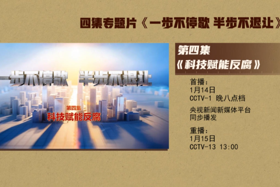 电视专题片《一步不停歇 半步不退让》第四集《科技赋能反腐》,讲述纪检监察机关丰富防治新型腐败和隐性腐败有效办法,以信息化赋能正风反腐,充分运用科技手段精准发现不正之风和腐败问题线索、迅速有效突破案件,着力提升智慧反腐、科技反腐水平。总台央视综合频道1月14日晚8点档播出,央视新闻新媒体平台同步播发。