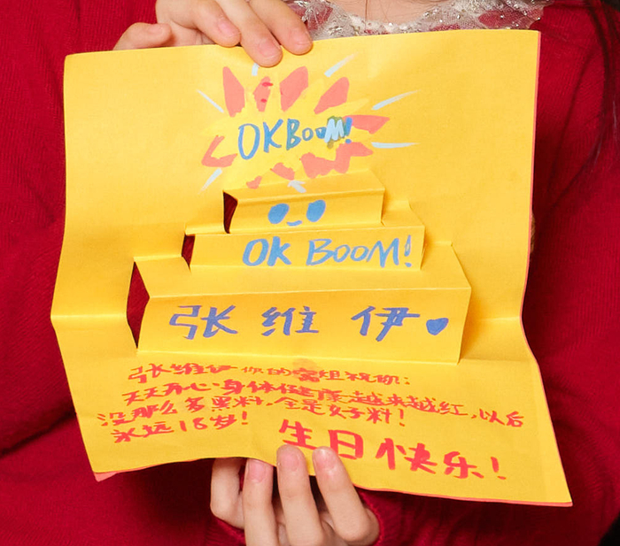 有网友放大图片发现,小酒窝的贺卡上写着:“张维伊,你的窝姐祝你:天天开心,身体健康,越来越红,以后没那么多黑料,全是好料!永远18岁,生日快乐!”