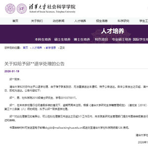[清华2名博士生拟被退学]近日,清华大学官网发布通告,对两名博士研究生作出予以退学处理,内文如下: