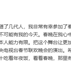 “中央电视台春节联欢晚会伴随了几代人,我非常有幸参加了春晚并通过春晚让大家认识了我。如果没有春晚就不可能有我的今天。春晚在我心中永远是最重要的,但是总是有告别的那一天。因本人能力有限,把这个舞台让更加出色的演员们去展现,本人从今往后不再参加中央电视台春节联欢晚会的演出。希望春晚越办越好。从今往后我会和您一样大年三十吃着年夜饭,看着春晚,那里有我们几代人美好的回忆!感恩!感谢!”