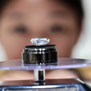 2025年7月9日,河南柘城的一家人造钻石企业钻石生产、销售两旺。河南柘城被誉为“钻石之都”,官方数据显示,柘城县年产金刚石单晶60亿克拉、金刚石微粉150亿克拉。图为人造钻石成品吸引消费者观赏。 中新社发 王中举 摄 IC Photo