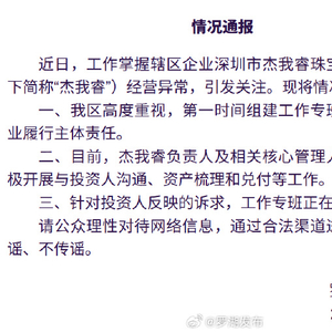 针对杰我睿珠宝经营异常,1月28日,罗湖区在官方微博“罗湖发布”中发布公告称,罗湖区高度重视,第一时间组建工作专班介入,督促企业履行主体责任。目前,杰我睿珠宝负责人及相关核心管理人员均在岗,积极开展与投资人沟通、资产梳理和兑付等工作。针对投资人反映的诉求,工作专班正在核查中。