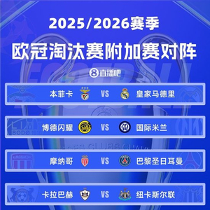 直播吧01月30日讯 2025-26赛季欧冠淘汰赛附加赛抽签结果出炉,穆帅带本菲卡再遇皇马,巴黎碰摩纳哥法甲内战,国米对决博德闪耀,尤文对阵加拉塔萨雷。