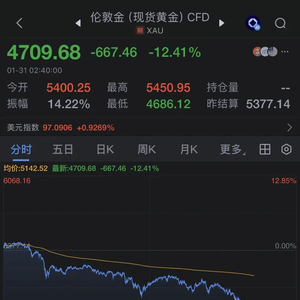 截至发稿,现货白银日内跌幅扩大至34.67%,从110美元/盎司上方一路跌至75.38美元/盎司。现货黄金日内跌幅扩大至12.41%,从5400美元/盎司跌至4709.68美元/盎司。