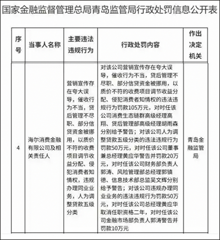 海尔消金遭罚国家金融监管总局网站