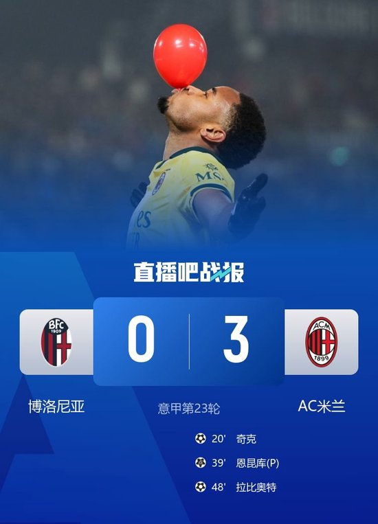 直播吧2月4日讯 北京时间2月4日凌晨3时45分,意甲第23轮,米兰做客雷纳托·达拉拉球场对阵博洛尼亚。上半场,奇克错失单刀良机,随后奇克破门首开记录,恩昆库点射扩大领先优势。米兰半场2-0领先博洛尼亚。下半场,拉比奥特破门。最终米兰3-0击败博洛尼亚,本赛季联赛对博洛尼亚完成双杀,米兰已保持22轮不败,继续排名联赛第二,距离榜首还有5分差距。