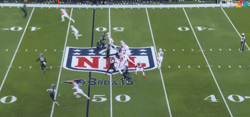 第三节还有7分钟时,爱国者队米尔顿·威廉姆斯擒杀达诺德,海鹰选择弃踢。
