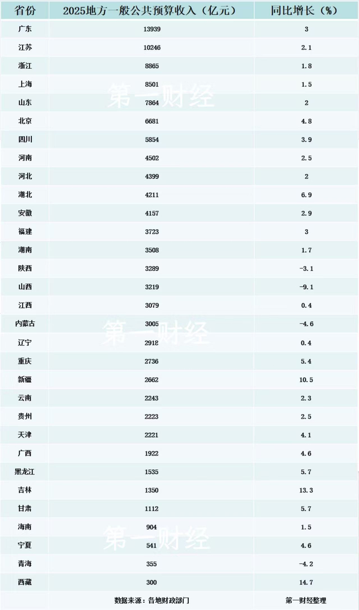 随着地方近期陆续披露当地政府“账本”,2025年31省份地方一般公共预算收入(下称“财政收入”)规模随之揭晓。