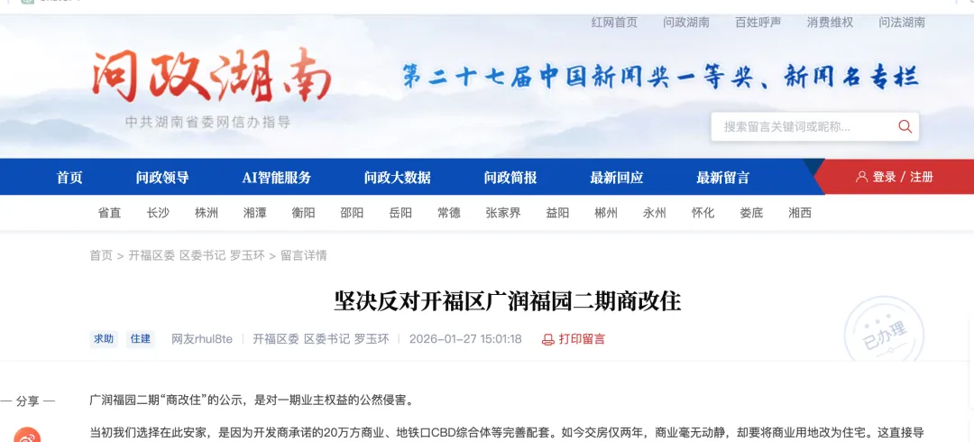 仅在“问政湖南”平台,每经记者就看到了多条明确反对商改住的投诉。