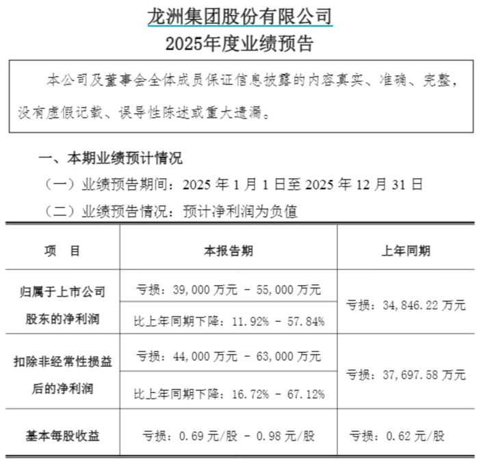 整个2025年,龙洲股份归母净利润预计亏损3.9亿元至5.5亿元,同比增亏11.92%至57.84%;预计扣非净利润亏损4.4亿元至6.3亿元,同比增亏16.72%至67.12%。