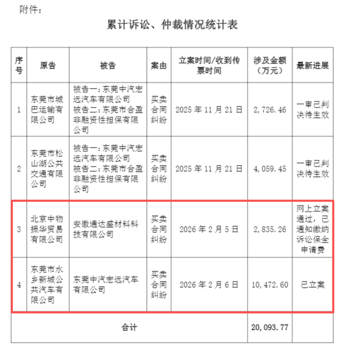 其中,2月6日,东莞市水乡新城公共汽车有限公司向中汽宏远提起诉讼,涉案金额1.05亿元,法院已立案,或与上述“电池翻车”案有相关。