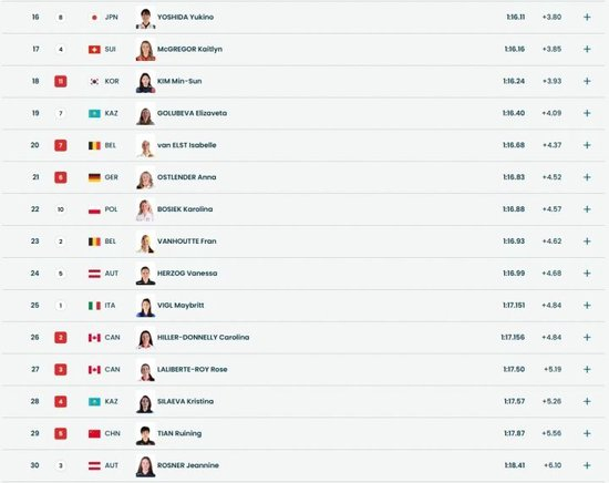 殷琦以1分15秒87的成绩超预期完赛,获第12名,韩梅以1分15秒97的成绩位列第13名,田芮宁以1分17秒87的成绩最终排名第29位。