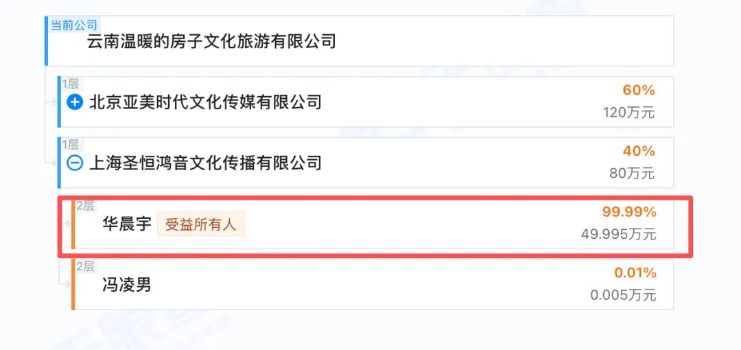 天眼查信息显示,2025年12月1日,华晨宇持股99%的上海圣恒鸿音文化传播有限公司,与长期主办“火星演唱会”的北京亚美时代文化传媒有限公司携手,共同成立了“云南温暖的房子文化旅游有限公司”,注册资本200万元,经营范围涵盖旅游业务、票务代理等,呼应了此次官宣中“温暖的房子”规划。