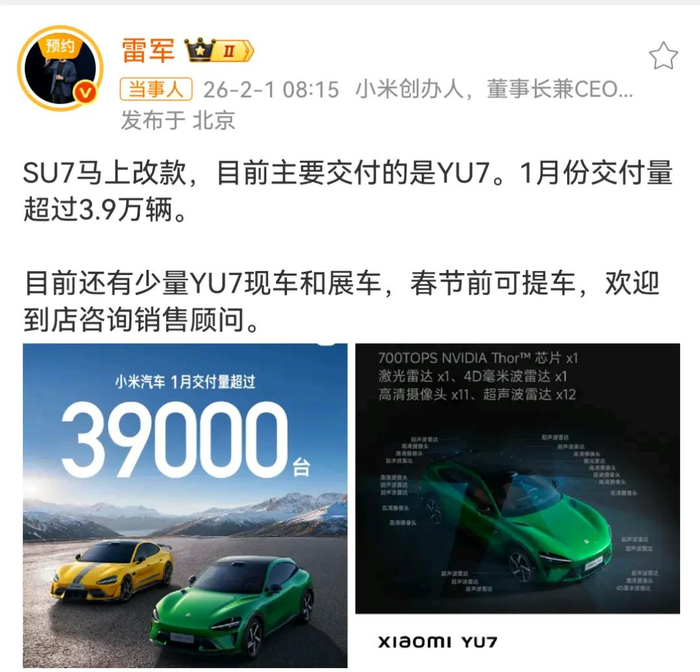 雷军发布微博称:“SU7马上改款,目前主要交付的是YU7。”