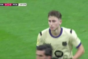 费尔明中框!第20分钟,巴萨的角球开出,费尔明门前转身扫射击中横梁。↓