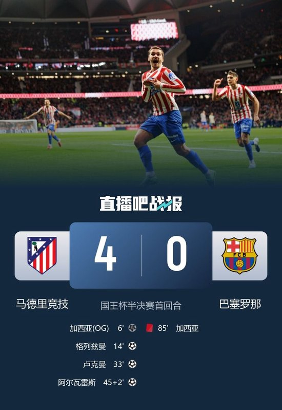 直播吧2月13日讯 北京时间2月13日凌晨4时整,2025-26赛季国王杯半决赛首回合在利雅得航空大都会球场展开角逐,马德里竞技主场迎战巴塞罗那。上半场霍安超巨失误送礼,埃里克乌龙,格列兹曼弑旧主,阿尔瓦雷斯和卢克曼互献传射,下半场库巴西进球被VAR判罚越位无效,埃里克直红。最终马竞首回合4-0大胜十人巴萨,马竞占得晋级决赛先机,巴萨各赛事6连胜终结,双方将于3月4日移师诺坎普球场进行次回合较量。