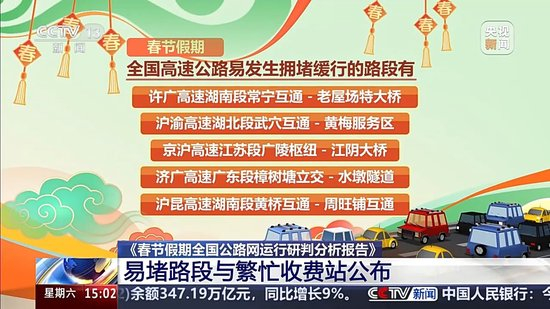 《春节假期全国高速公路路网运行研判分析报告》还发布了春节假期全国高速公路易发生拥堵缓行的路段和收费站。
