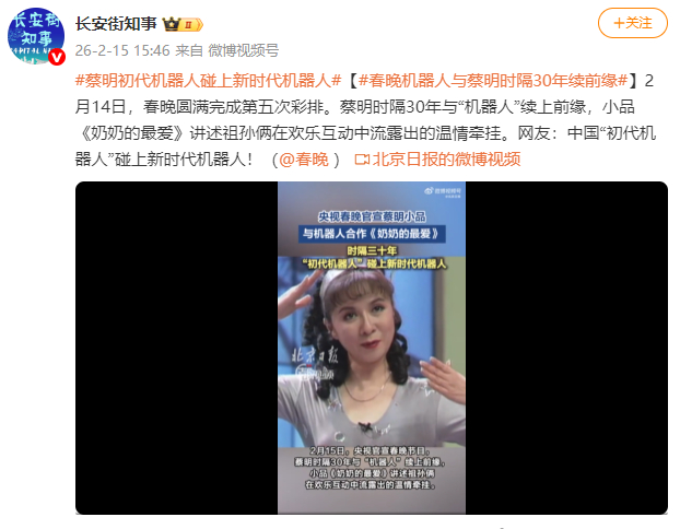 [春晚机器人与蔡明时隔30年续前缘]2月14日,春晚圆满完成第五次彩排。蔡明时隔30年与“机器人”续上前缘,小品《奶奶的最爱》讲述祖孙俩在欢乐互动中流露出的温情牵挂。网友:中国“初代机器人”碰上新时代机器人!(@春晚 )