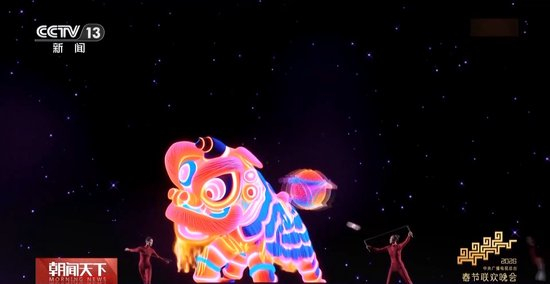 以全新的视觉呈现方式配合传统杂技节目表演,也是今年春晚舞美的创新表达。《绘新春》中,中外演员以空竹和捷克棒抛动,引出海浪的波浪感,醒狮贺岁等经典的吉祥寓意,被巧妙融入杂技演员的表演中。