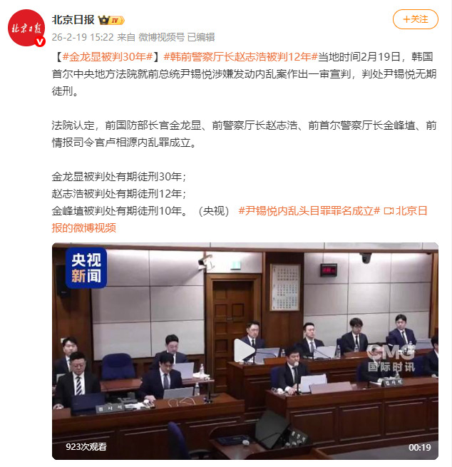[金龙显被判30年]当地时间2月19日,韩国首尔中央地方法院就前总统尹锡悦涉嫌发动内乱案作出一审宣判,判处尹锡悦无期徒刑。