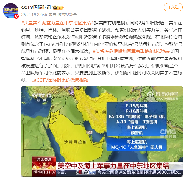 财联社2月19日电,据美国有线电视新闻网2月18日报道,美军在约旦、沙特、巴林、阿联酋等多国部署了战机、预警机和无人机等力量。美军还在红海、波斯湾和霍尔木兹海峡附近部署了多艘驱逐舰和濒海战斗舰,在北阿拉伯海则有包含了F-35C“闪电”II型战斗机在内的“亚伯拉罕·林肯”号航母打击群。“福特”号航母打击群预计最早在本周末抵达。美国智库科学和国际安全研究所的专家通过分析卫星图像发现,伊朗近期对军事设施和核设施进行了加固。此外,伊朗和俄罗斯19日开始联合海军演习。伊朗伊斯兰革命卫队海军司令此前表示,只要接到上级指令,伊朗海军随时可以关闭霍尔木兹海峡。 (CCTV国际时讯)