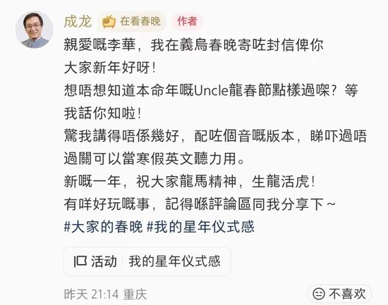 2月19日,“成龙给春晚和李华写了一封信”的词条,冲上热点。