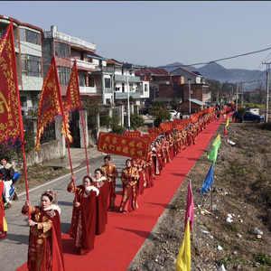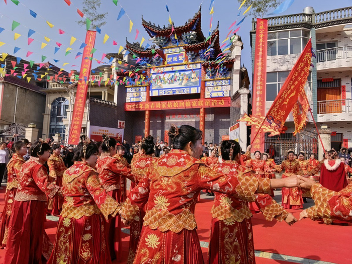 2月22日上午,湖北阳新县排市镇下桥村周氏文化礼堂前鞭炮齐鸣,锣鼓喧天,隆重迎接90位外嫁的姑娘集体回娘家。