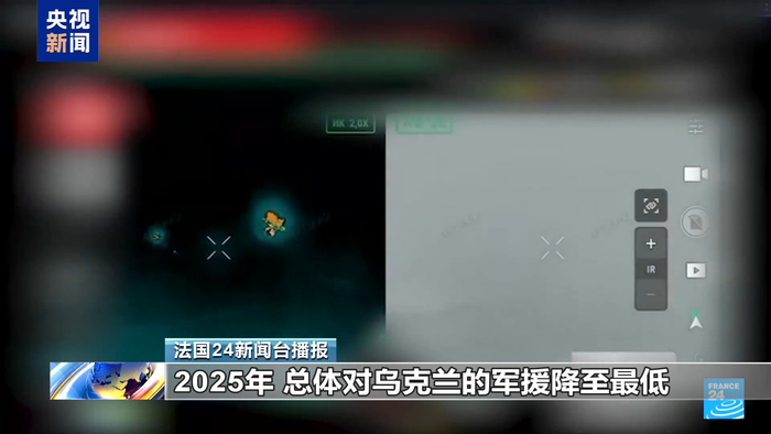 法国24新闻台播报:2025年,总体对乌克兰的军援降至最低,大约为360亿欧元,美国政府大幅减少了援助,而欧洲提供了最多的资金,较前两年的平均水平高出三分之二。