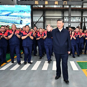 这是2025年7月7日下午,习近平总书记在阳泉阀门股份有限公司考察时,同企业员工在一起。新华社记者 燕雁 摄