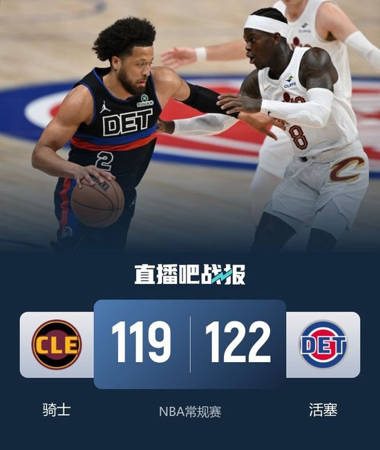 比赛开始,活塞率先发力,但梅里尔和小莫布里连续3记三分反超比分,贾勒特·阿伦内线弹无虚发,坎宁安也能强势回应,骑士替补发力领先8分,次节骑士一度领先双位数,但双方命中率都有下降,坎宁安有攻有传带队始终能咬住比分。下半场,杜伦攻防建功,活塞顺势反超比分,现场设备出现问题休战一段时间,双方拉锯比分交替领先,末节骑士轰出15-2攻击波再次反超回来,坎宁安连续丢罚球且6犯毕业,骑士关键挑战成功,但贾勒特·阿伦6犯后活塞追到差1分,小莫布里关键两罚一中,詹金斯造三罚全罚中,双方进入加时。加时赛,活塞连得6分后泰森三分止血,邓罗6犯毕业,活塞关键挑战成功后哈里斯中投领先到3分,梅里尔和小莫布里相继三分不中,最终活塞加时122-119逆转骑士。
