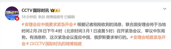 据CCTV国际时讯,联合国安理会将于当地时间2月28日下午4时(北京时间3月1日凌晨5时)召开紧急会议,审议中东局势。有消息称,这次紧急会议是应中国、俄罗斯要求举行的。