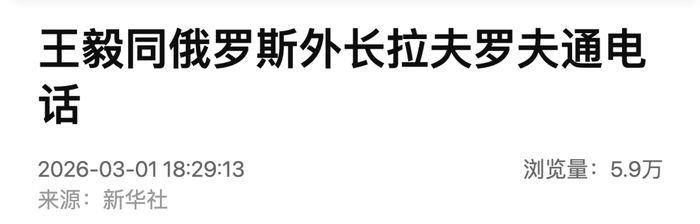 3月1日,中共中央政治局委员、外交部长王毅应约同俄罗斯外长拉夫罗夫通电话。