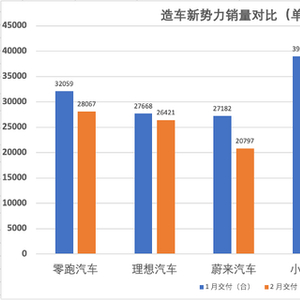 3月1日,多家造车新势力陆续披露2月交付量数据。受春节假期带来的有效工作日缩减、节前需求提前释放等季节性因素影响,车企2月交付数据有不同程度的环比下滑,其中,位居第一的零跑汽车交付量滑落到了3万辆以下;截至发稿,鸿蒙智行方面仍未披露2月交付数据。